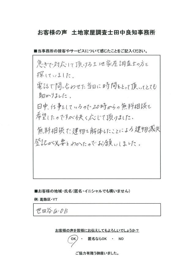 無料相談で、建物を解体したことによる建物滅失登記が必要とわかったのでお願いしました。